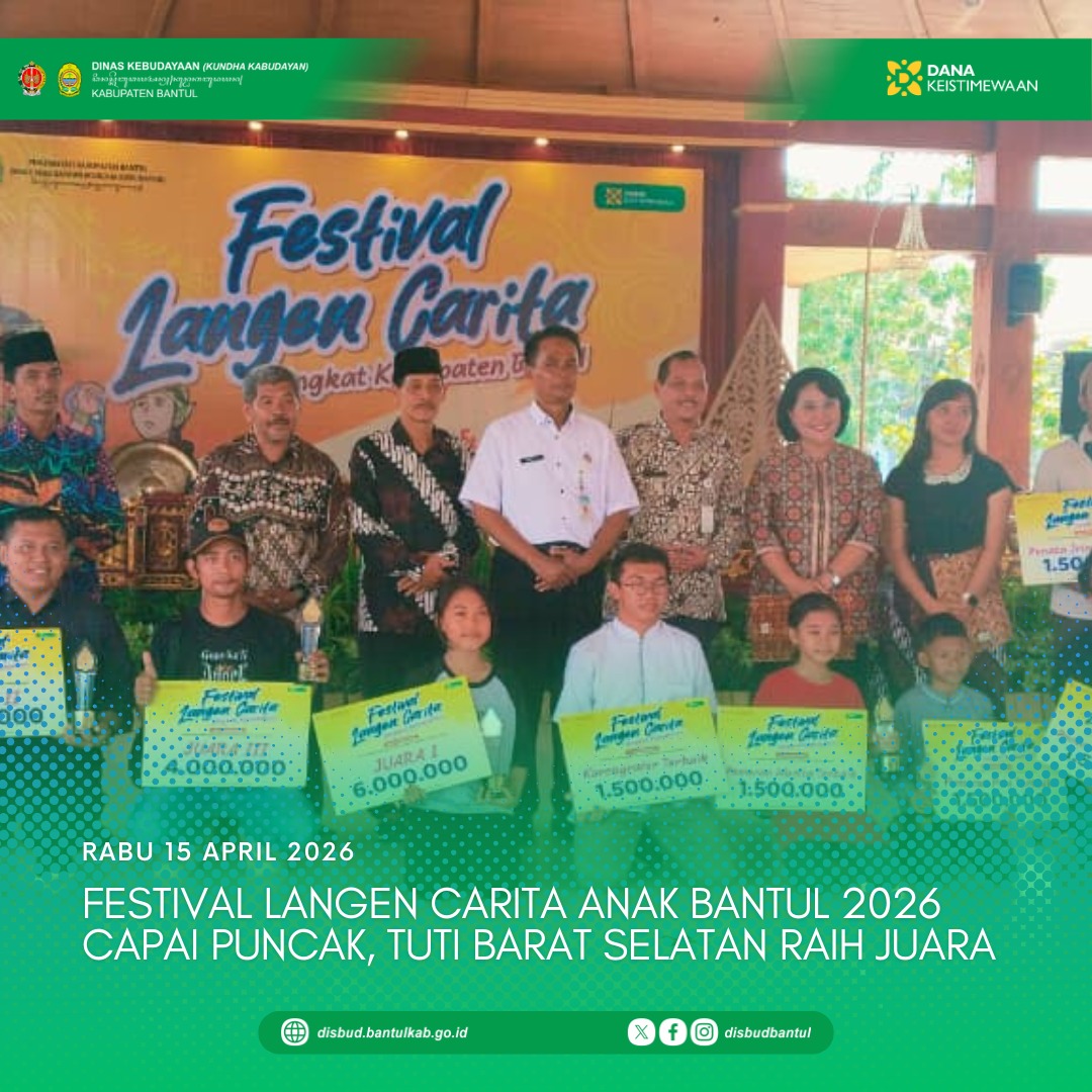 Bantul – Festival Langen Carita Anak Tingkat Kabupaten Bantul Tahun 2026 resmi mencapai puncaknya dengan pengumuman pemenang yang digelar pada Rabu (15/4/2026) di Pendapa Parasamya II, Kompleks...