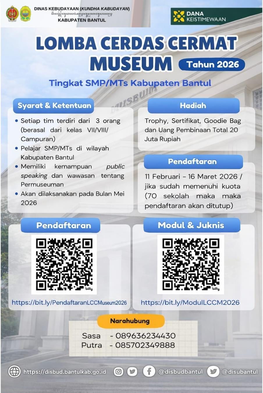 Lomba Cerdas Cermat Museum (LCCM) Tahun 2026 resmi dibuka!Ajang bergengsi tingkat SMP/MTs se-Kabupaten Bantul ini menjadi ruang belajar sekaligus berkompetisi untuk menumbuhkan pengetahuan, public...