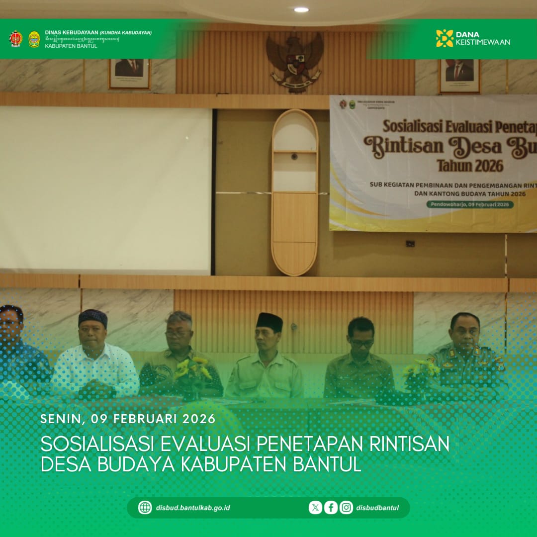 Sewon — Dinas Kebudayaan (Kundha Kabudayan) Kabupaten Bantul menyelenggarakan kegiatan Sosialisasi Evaluasi Penetapan Rintisan Desa Budaya Kabupaten Bantul pada Senin, 9 Februari 2026. Kegiatan...