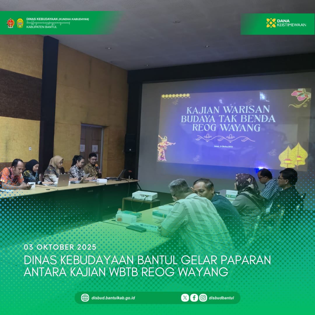 Bantul – Dinas Kebudayaan (Kundha Kabudayan) Kabupaten Bantul melaksanakan kegiatan Paparan Antara Kajian Warisan Budaya Takbenda Reog Wayang, pada Jumat (03/10/2025) pukul 13.00 WIB di Ruang Mandala Karya, Kantor Dinas Kebudayaan Bantul.