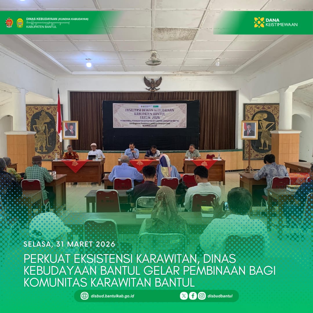 Jetis - Dewan Kebudayaan Kabupaten Bantul menggelar kegiatan fasilitasi bertema “Pembinaan dan Peningkatan Kapasitas Komunitas Karawitan Kabupaten Bantul” pada Selasa, 31 Maret 2026 pukul 09.00...